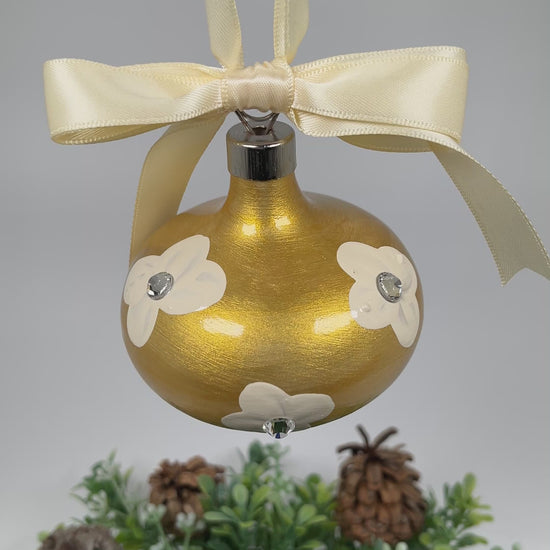 The Joanna Hand Painted Ornament features a gold base coat and cream flowers with rhinestone centers. Painted using acrylic paints.