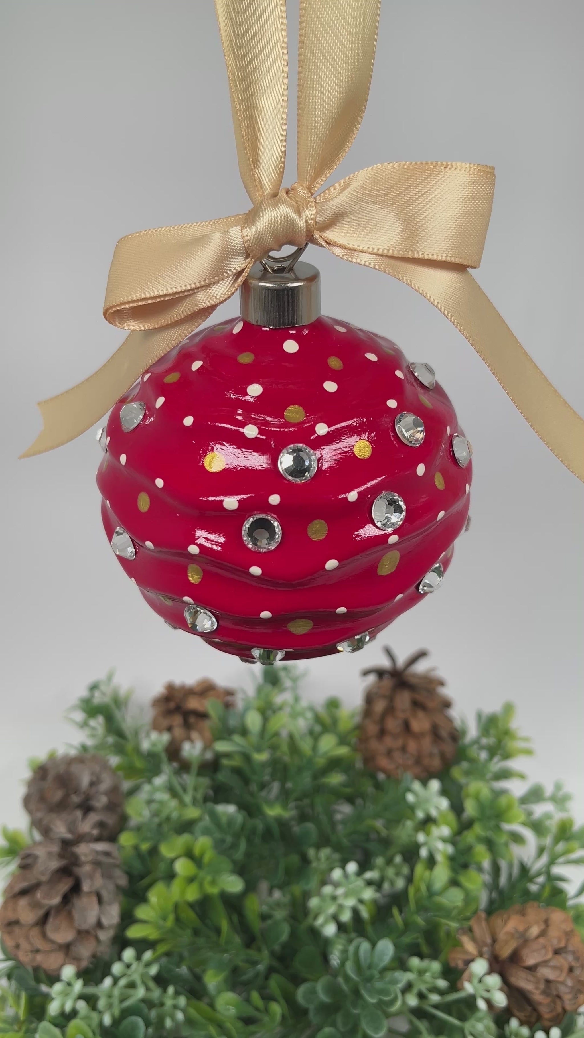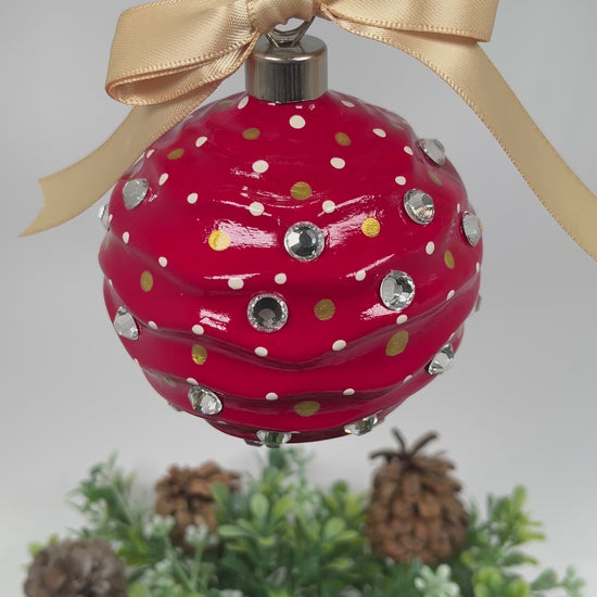 The Scarlett Hand Painted Ornament features a bright red base coat with cream and gold polka dots and sparkly rhinestones. Painted using acrylic paints.